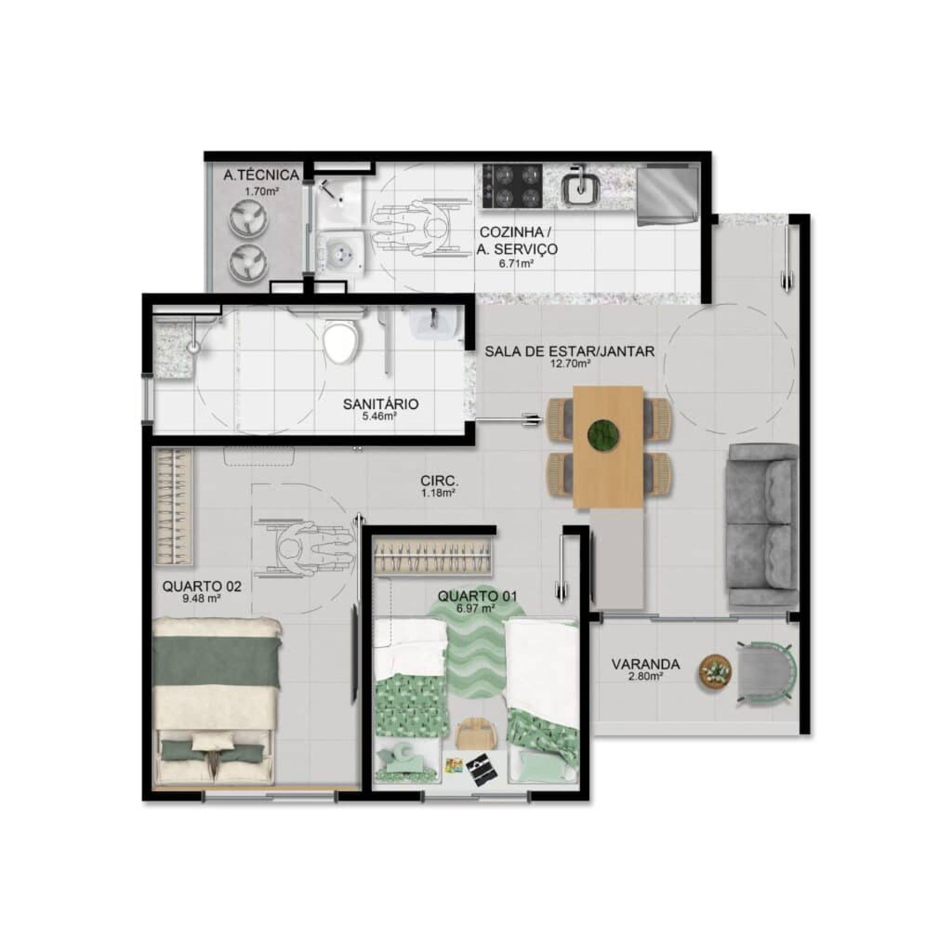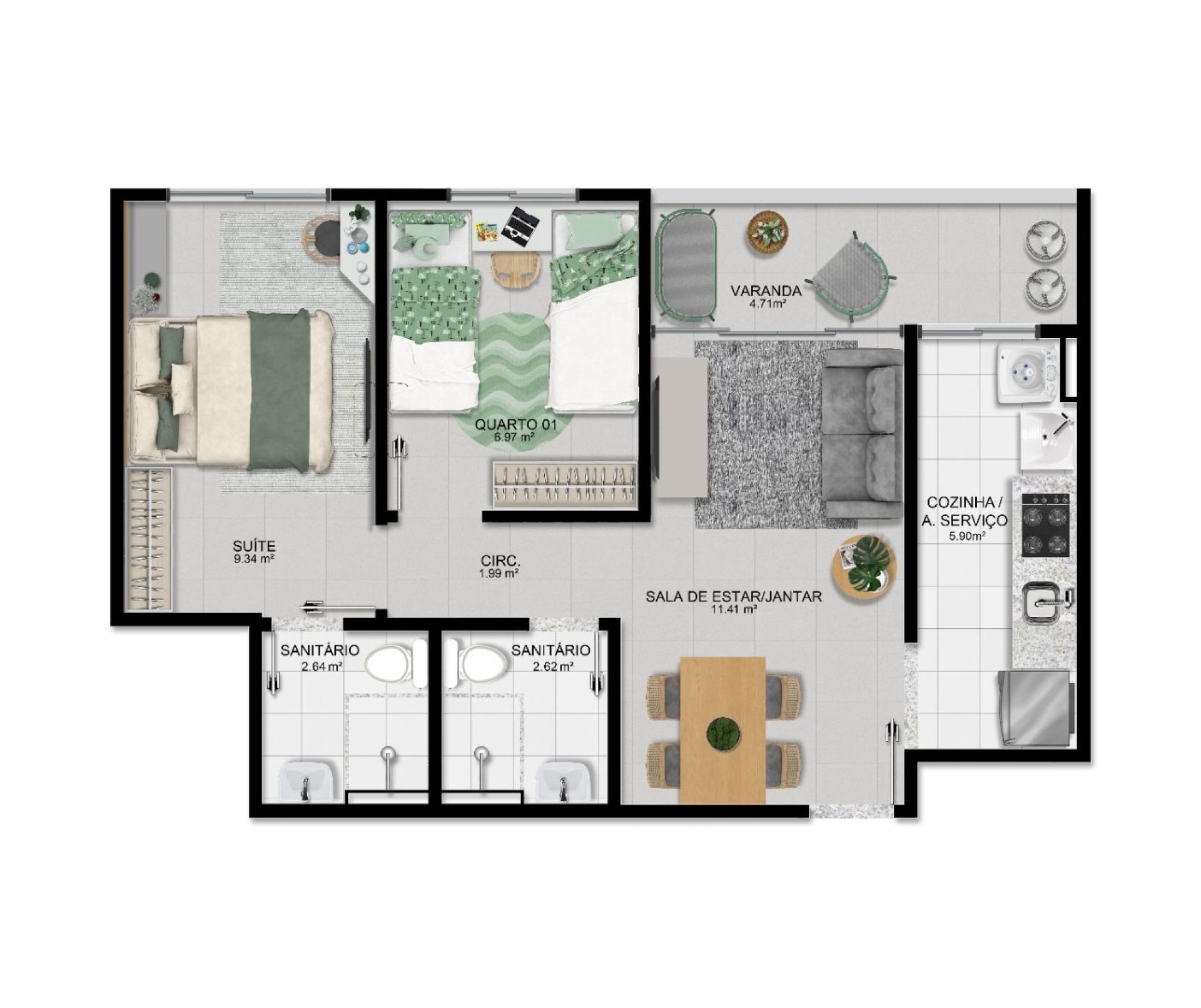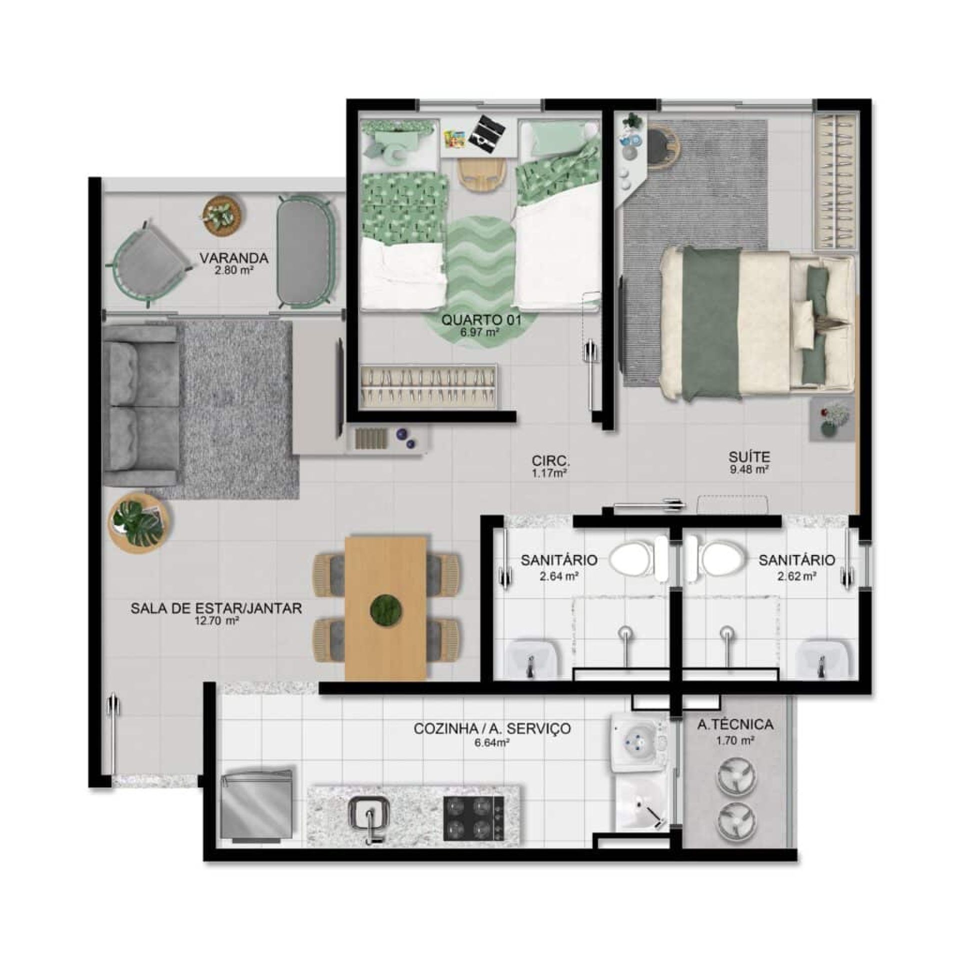 As unidades do Vivver Exclusive foram planejadas para oferecer conforto e praticidade, com plantas que aproveitam bem cada metro quadrado e facilitam a organização dos ambientes.